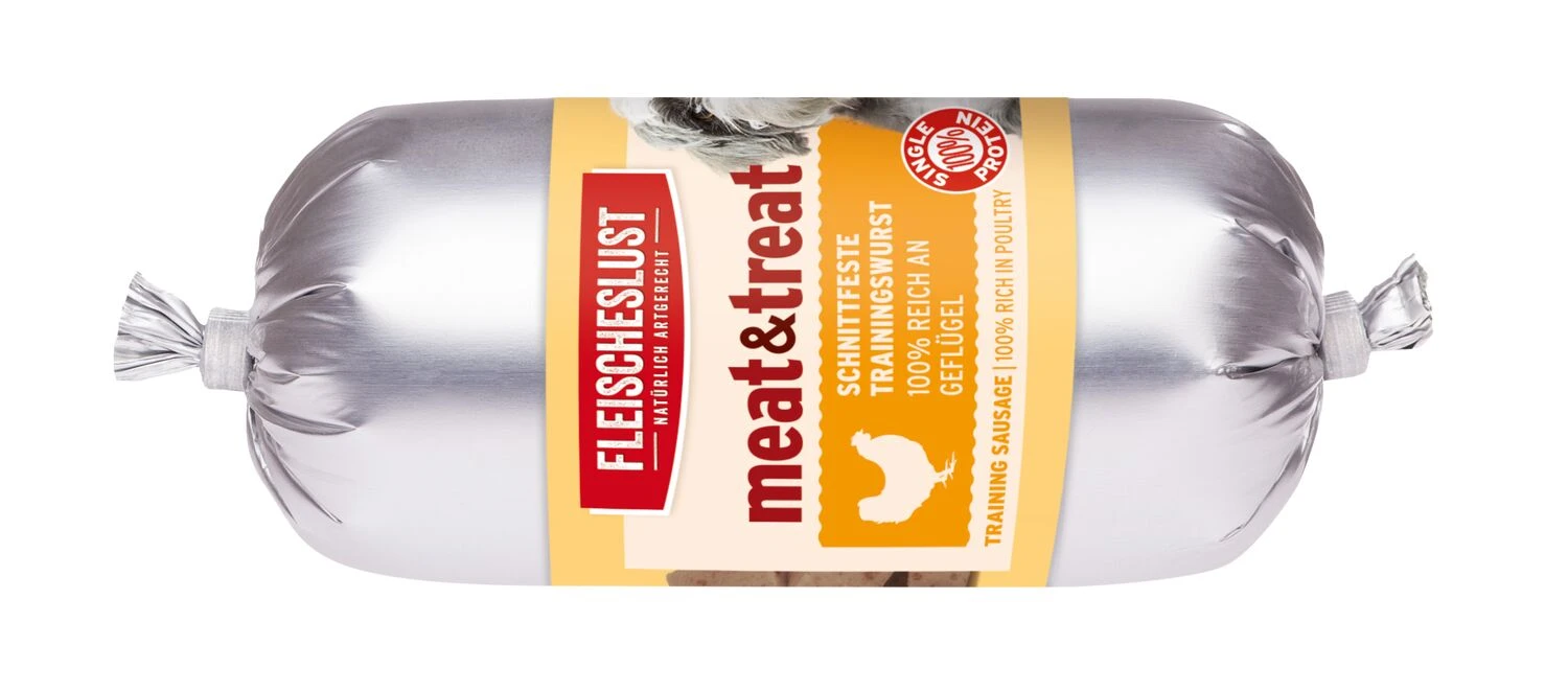THE MOST SUCCESSFUL SAUSAGE EVER. Meat & Treat is a sole feed that has been specifically developed as a healthy and species appropriate dog snack. The sausages have a firm consistency and can be easily and cleanly portioned in many small pieces. The best lean meat, heart and a little fat are the ingredients for our new training sausages. Only one protein source is processed in the Meat & Treat dog snacks, and so they are also a real “dog’s delight” for four-legged friends that are sensitive to food.
